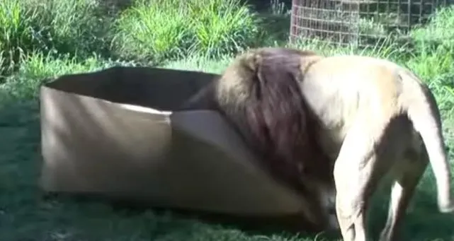 狮子前一秒:我超凶!下一秒:耶!纸箱! 美国佛罗里达动物保护机构的工作人员将箱子放在这些大型猫科动物面前,一只凶猛的雄狮钻了进去。虽然脆弱的纸箱很快被压变形,不过还是证明了纸箱的诱惑力。