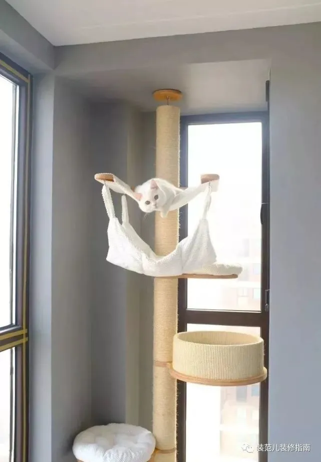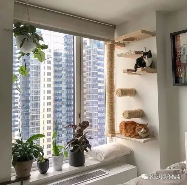 喵星人长时间处于狭小的空间,不仅会感到无聊,还会有莫名的压力,所以和喵星人同住的话,要在家里为他们准备一个可以充分运动的“乐园”,按照喵星人的习性去设计。 喵喜欢从高处眺望的视角,最简单直接的就是买一个猫爬架,将猫爬架放在靠近阳台或窗边的角落,让喵爬到高处后可以眺望远处的风景。