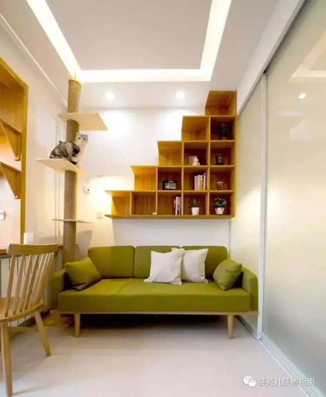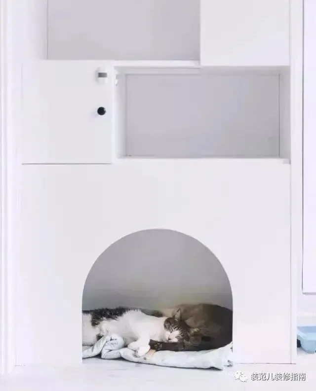 小户型的话,可以将收纳和猫的攀爬区合二为一:在定制的储物柜上规划出喵睡觉和玩耍的地方,下面是喵窝。 可以将隔板通过打洞的方式上下连通,供喵尽情玩耍,带柜门的区域可以用来储存柱子的口粮和日常用品。