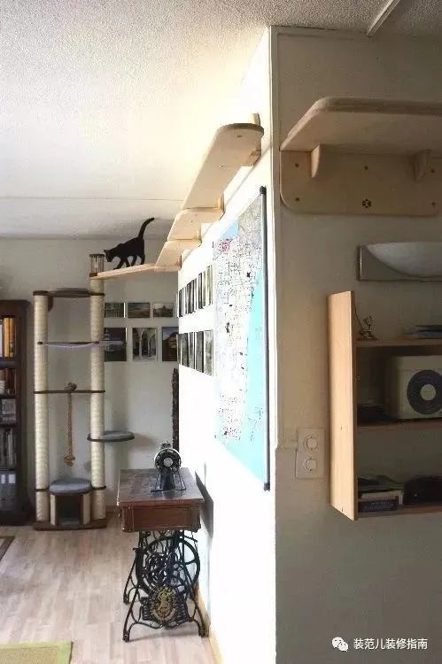 还可以在客厅的上方做一个环绕的跑道,让喵能自由的在跑到离穿梭。这样做也属于把人的动线和喵的主要动线彻底分开。