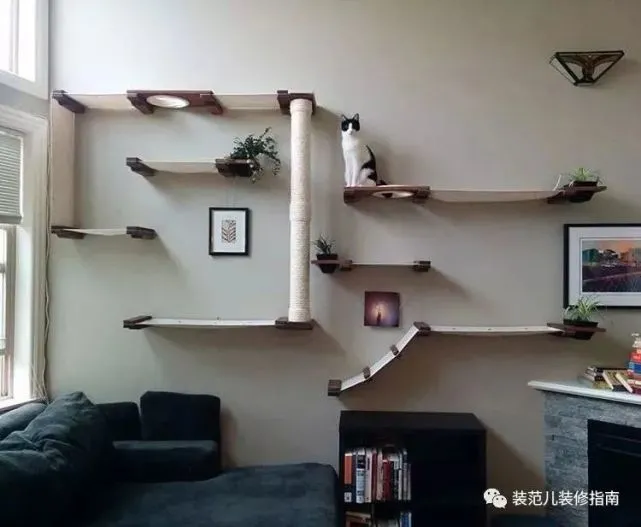 如果家里拥有一整面闲置的墙面,可以考虑做一组猫墙。将步行道、跳板、软体组合在一起,让喵们自由跳跃、自由飞翔。