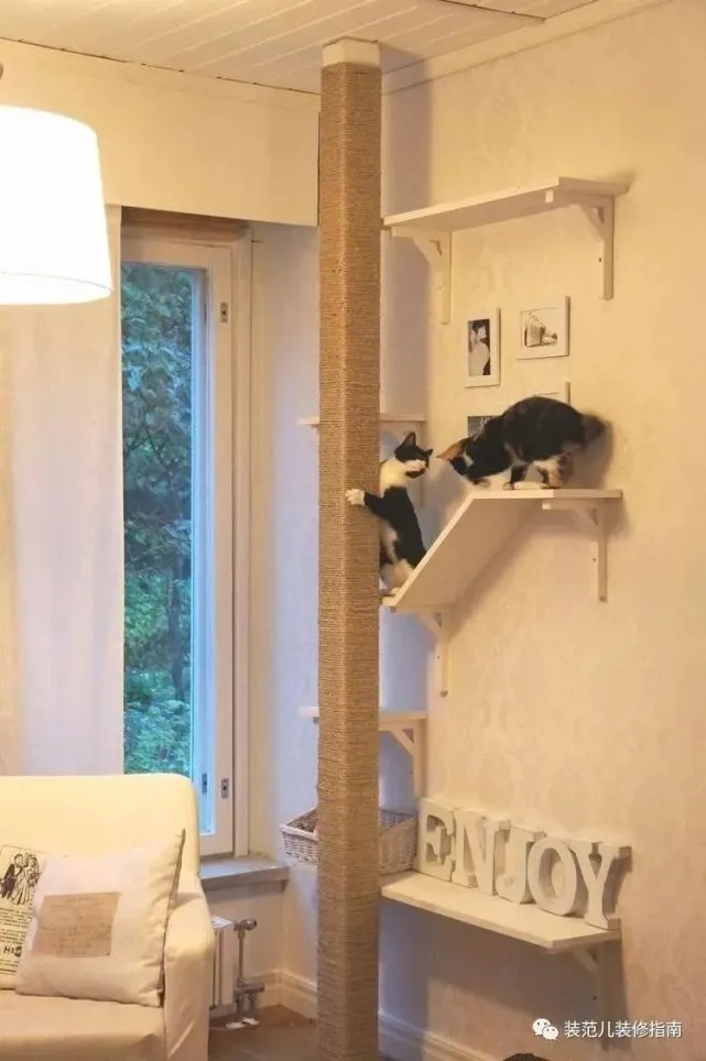如果家里有碍眼的柱子或水管,可以用麻绳缠绕,两侧再安装上隔板,这样一套自制的猫爬架就做好了,既规避了难看的柱子或水管,还达到了对喵们的实用功能。