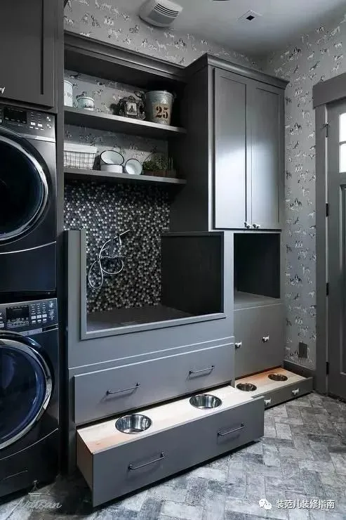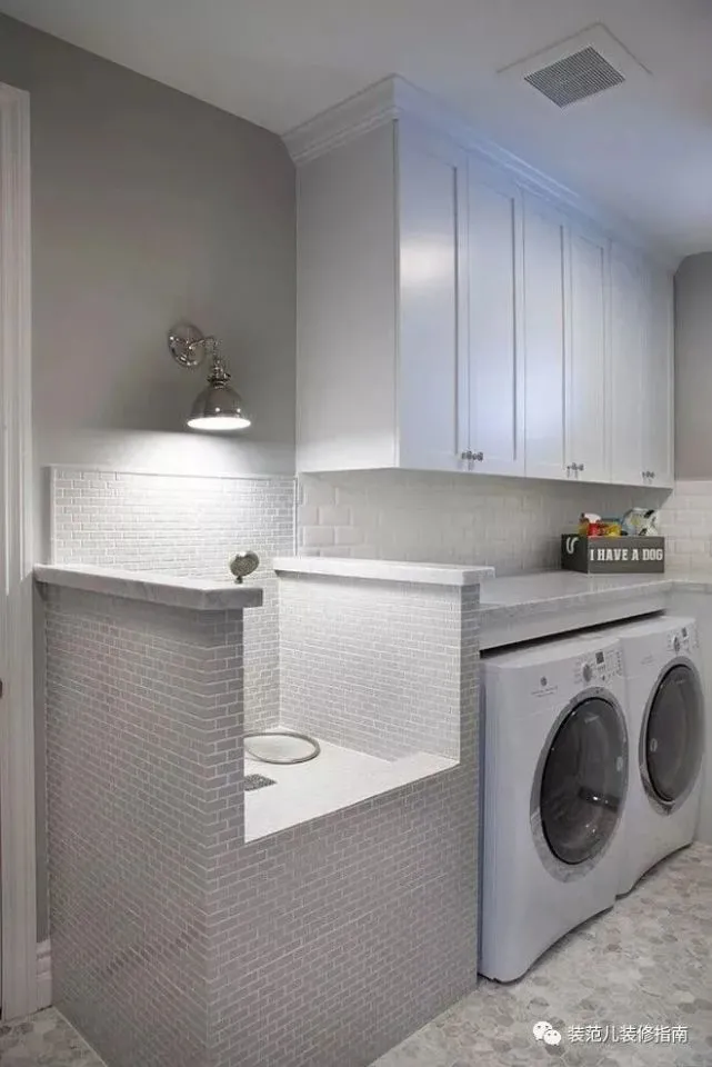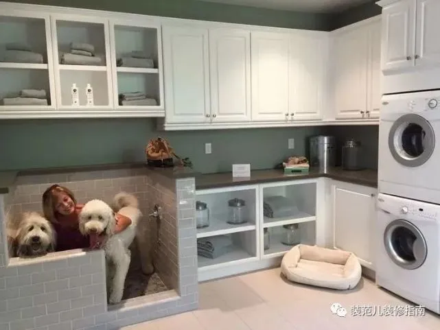 NO.04 人宠共洗不卫生? 给它们专门的澡堂和洗衣机 家里有汪星人的话,每次给它们洗澡都像打架一样,死活不肯进浴室,把狗狗放在浴缸洗澡,洗完还得把浴缸里里外外清洗消毒一遍,非常麻烦。 不如参考国外屋主的做法,在家政阳台砌一个专门的宠物洗澡区,免去了洗完狗还得洗浴缸的麻烦。半开放式的设计,狗狗想逃跑也没那么容易。