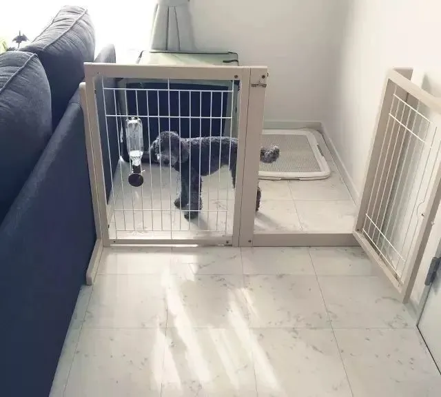如果担心外出的时候狗狗在家中捣乱,也可以用同样的方法在家中围出一个限定活动区。