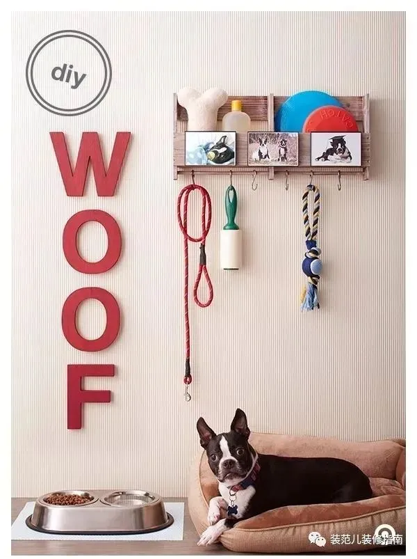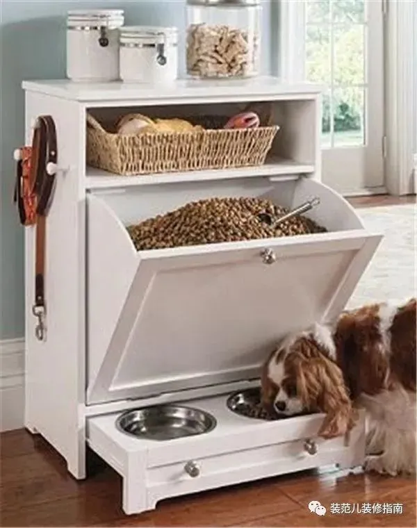 一个包含了粮食储藏、抽屉食盆、狗带悬挂的边柜就很不错。 留出放狗狗外出的绳子、衣服、铲屎袋的空间,多利用挂钩,一目了然,出门的时候就不用再一通乱找。