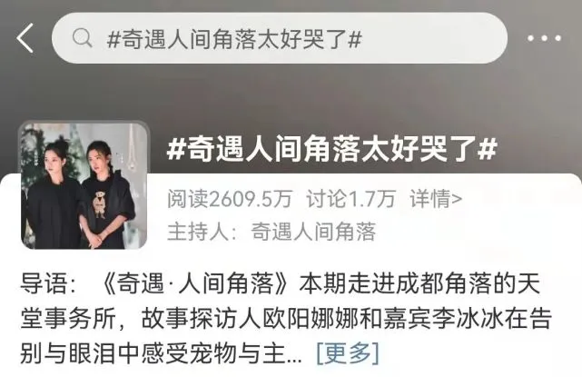 在《奇遇 · 人间角落》第3期,固定嘉宾欧阳娜娜和飞行嘉宾李冰冰,探访了成都市的一个角落——宠物殡葬馆天堂事务所,体验了宠物殡葬师这个不同寻常的职业 。