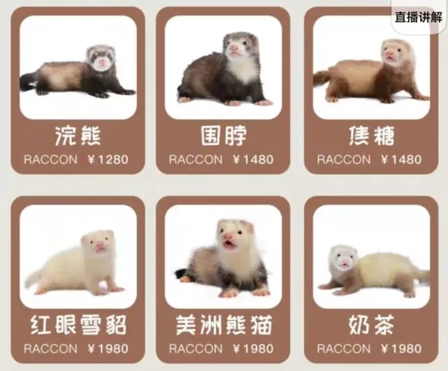不同花色的宠物雪貂 前景与隐忧 异宠市场的火热,也一并带动了产业链的上下游。 住所和食物,是异宠的两大刚性开支:从简单的鸟笼、蝈蝈葫芦,到配置复杂的水族箱、生态缸;从随处可得的干草、蔬菜,到喂养蛇类的小鼠、鹌鹑,供给蝈蝈、仓鼠的面包虫。可以预见,就像猫狗宠物用品逐步趋向精致化一样,异宠市场的繁荣,也将带着相关产业“冲击高端”。