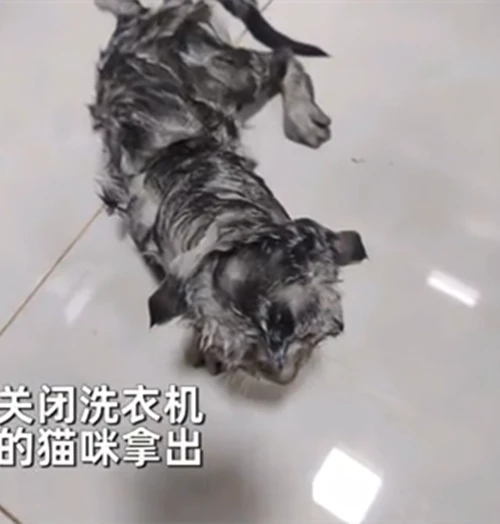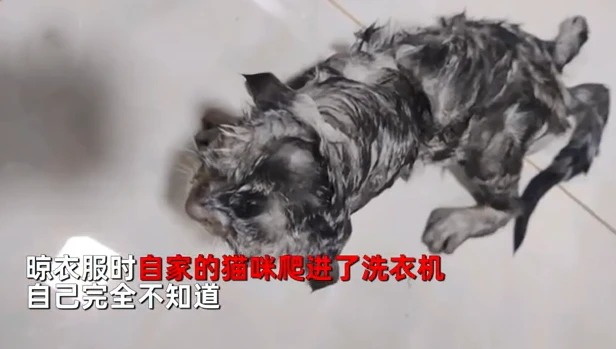 但是随着猫叫声越来越大,女子赶紧暂停了洗衣机,将里面的衣服取出,随后却愣住了:我滴个乖乖啊! 原来自己的猫还真的在里面,此时的它浑身湿漉漉的,就像是溺水了一样!差一点点就进入甩干阶段,变成“猫干”了。 女子特别困惑,这家伙是啥时候跑进去的呢?