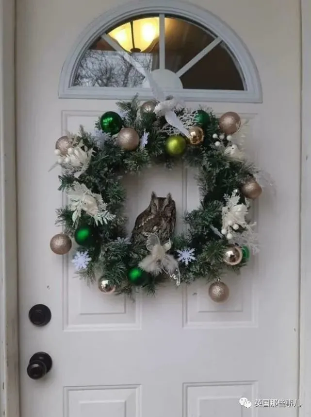 一只猫头鹰在圣诞花环上睡着了。