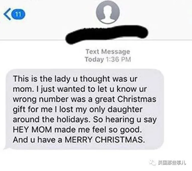 我给妈妈打电话,不小心拨错号了,后来收到一条信息。 “我是你打错电话的那位女士。 我想跟你说,对我来说你打错的电话是一份绝美的圣诞礼物,因为我唯一的女儿是在圣诞节前后过世的。 所以听到你说的那声‘嗨,妈妈’,让我感慨万千。 祝你圣诞快乐。”