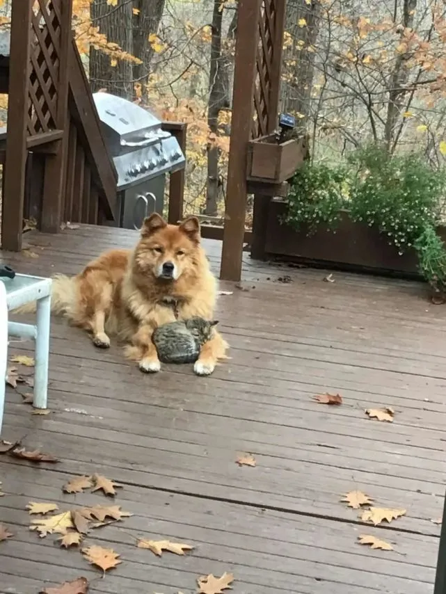 大家一开始并不知道贝利在忙啥,直到看见这一幕: 贝利趴在门廊上,而它怀里蜷缩着一只小猫...