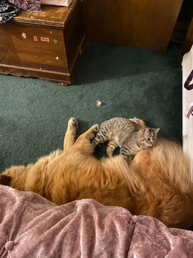 贝利就像一个母亲似的,照顾着小猫,而小猫也像个小狗崽似的,形影不离的跟在贝利后面,它以贝利“孩子”的身份,彻底融入了这个家。 家里多了个猫,但不是自己主动养的,而是自家狗子收养的,这件事也是很奇妙了!