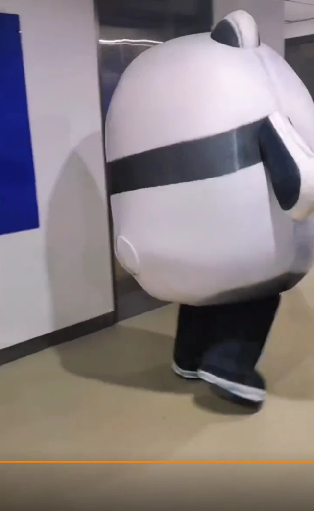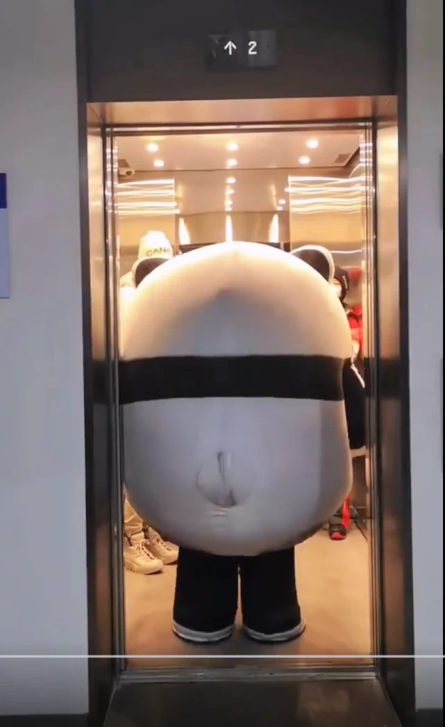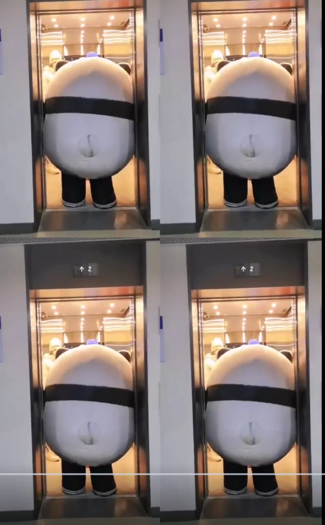 只见冰墩墩屁股朝外拼命往外挤,差点被电梯门卡住,费尽力气才从电梯中挤出来。