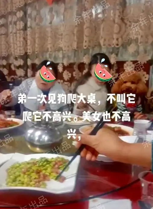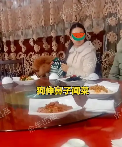 到最后,进来的最迟的人,没地方坐了,只好围坐在这一桌。 有人建议女子将狗放下去,女子一脸不悦,称“狗狗会不高兴”。 劝说无果,酒席已经开始,大家只好耐着性子,忍耐下来。 于是,就发生了画面中的一幕,一桌人吃饭,一个狗狗探头探脑在桌子上左右闻。