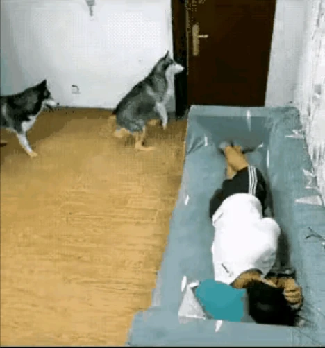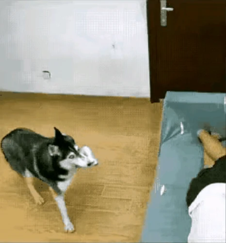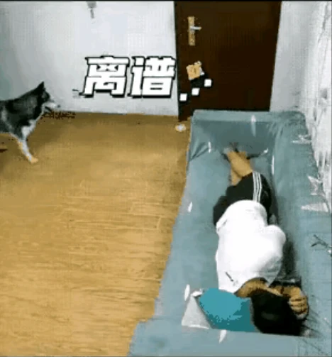 而这一下的声音也是被狗狗听到了吓了一跳,狗狗立马醒了。狗狗被这突如其来的意外惊了,还跑到主人身边去嗅了嗅。结果狗狗当即被吓跑。