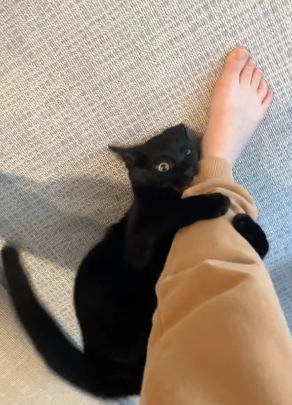 刚一挪步,猫咪立马攀上右边脚,这边也是我的,不许走!