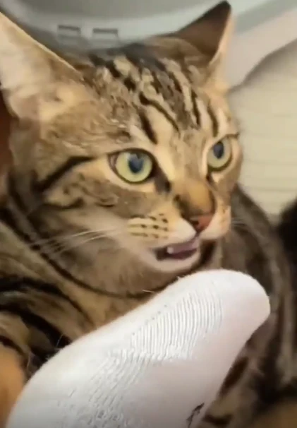 不仅闻不够,猫咪还越凑越近,直接上手,一把抓住铲屎官的臭jio! 咦,这是我从来没有尝过的味道诶?