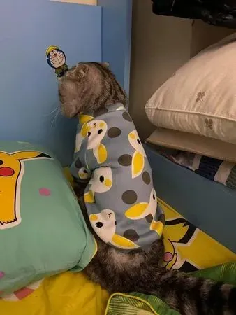 饭团:本喵今天要待在家。 “不去医院......不打针......不要逼偶。”饭团身穿水蓝色的兔子点点装,明明已经睡醒起床了,还是坚持要把屁股紧紧黏在床上,原来它知道自己要去动物医院打针,说什么都不肯乖乖出门,故意在主人面前闹别扭,转过身面壁思考猫生表达抗议的决心,发起脾气来任谁都没辄。