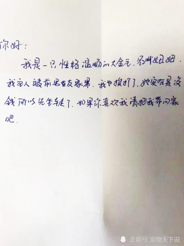 网友才知道这狗已经没有主人了,连忙跑去查看狗狗,结果在狗狗身上有一张纸条:原来金毛叫妞妞,遗弃妞妞的这个女孩有一个脾气暴躁的男朋友,他不但打女孩,就连温顺的妞妞也会挨打,这次是女孩好不容易才逮住机会,带着妞妞偷溜出来的。准备一起回家。但是等到了车站,女孩又实在没有多余的钱带妞妞走,而且宠物乘坐交通工具很麻烦,如果让狗狗留在男友家里,也是一样挨打,还不如让好心人帮忙收留。字里行间可以看得出,女孩还是很舍不得妞妞的。