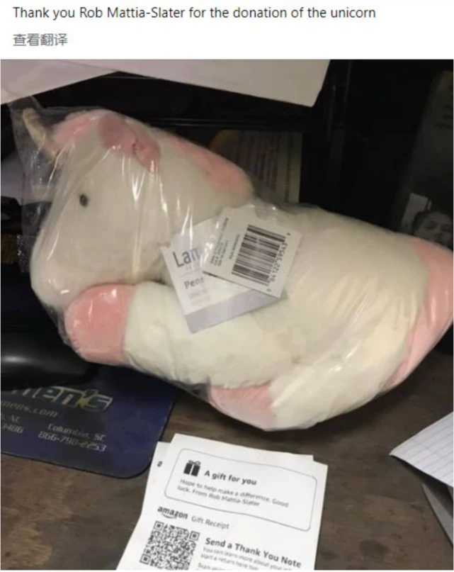 老板只能向当地管理部分求助,希望机构能带走狗狗,不要再让它在街上到处溜达了。 知道毛孩子要被接走了,店员们决定给它留下一个温暖的回忆: 大家特地买下了Susi心心念念的独角兽送给它。