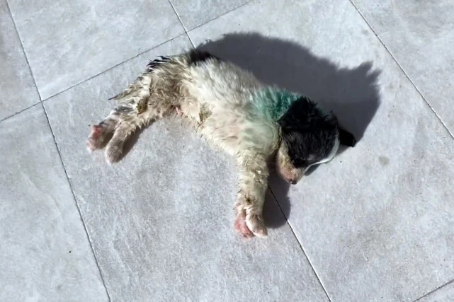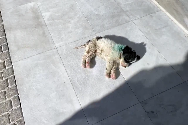 倒在路边的小流浪狗 一只脏兮兮的小狗,一动不动地躺在路边,要不是狗狗的肚皮,还在有规律地上下起伏,大家还以为这只狗已经不在了。