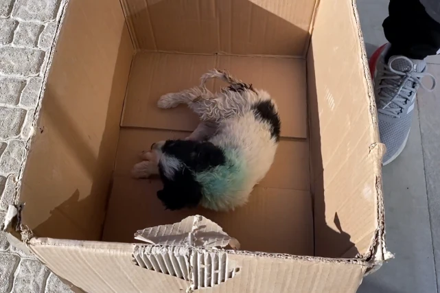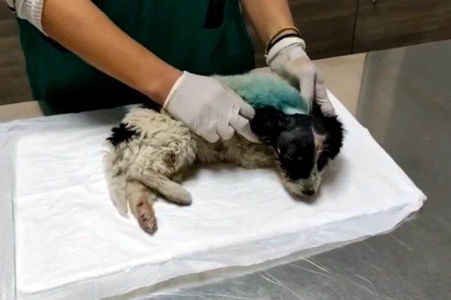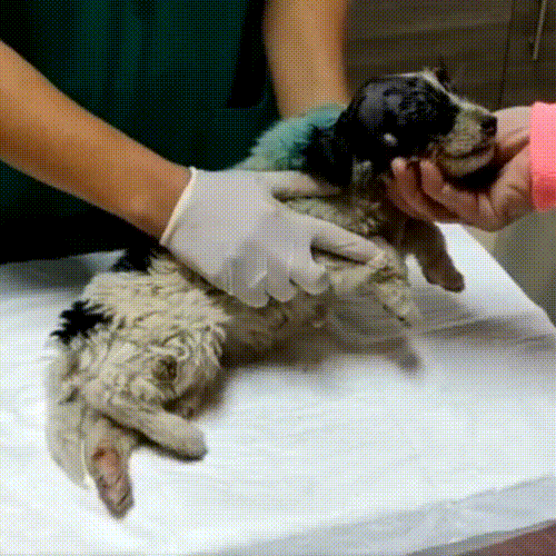 上药的过程中,狗狗疼得直叫,身体止不住颤抖,它只是一只仅有3个月大的小狗呀,是谁那么残忍,忍心对这么小的狗狗下手呢?