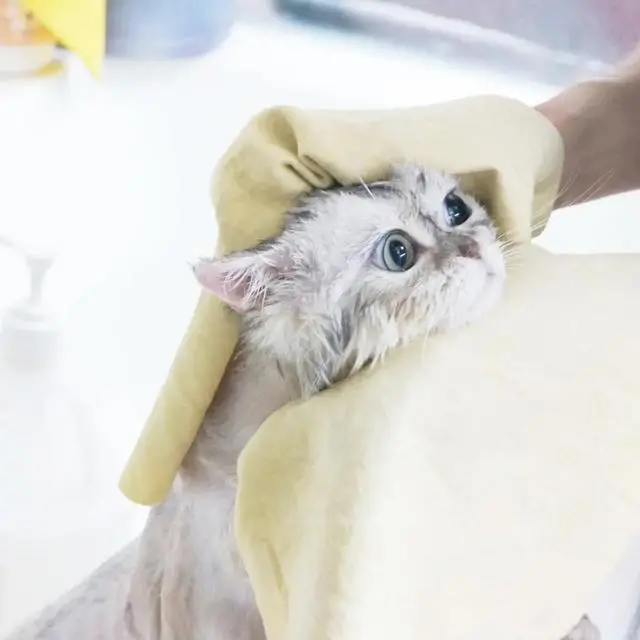 最后,洗澡完成后,用吸水性好的毛巾将猫咪包裹住。 然后一点点帮助猫咪擦干净身上,直到毛巾上面不能挤出来水结束。 只有擦拭猫咪的时候足够努力,才能减少给猫咪吹毛的时间。 要知道,猫咪对吹风机实在是太恐惧了。