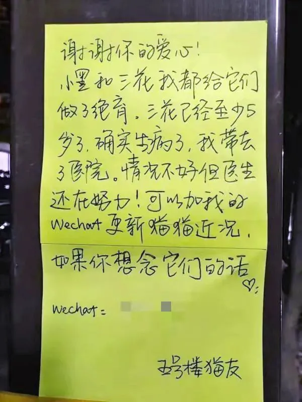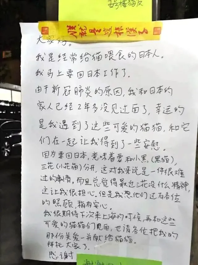 永田功牵挂的小黑和三花 看到大家的接力字条,得知邻居带三花去治病了,永田终于放心了。他说如果康复得好,今年秋冬他会再回上海,看看这些“毛孩子”,并当面和各位邻居说声感谢。“以前是我自己一个人喂猫咪,今后我会加入大家的行列,和大家一起来关爱这些‘毛孩子’。这片土地的人们温暖且人情味十足,我的感激之情无以言表。”