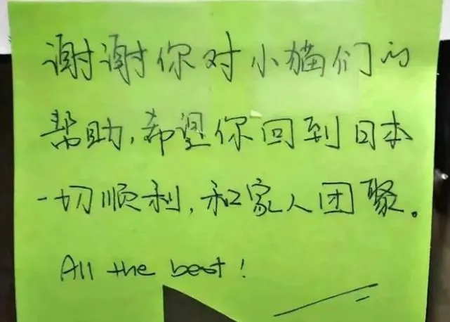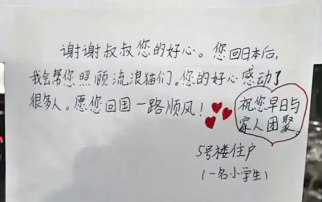 由于当天就回国了,这位日本人并没能亲眼看到这些暖心的字条。有位记者加了他的微信,并把邻居们的字条拍照发给他。 这位日本人叫永田功,今年51岁,字条是他写好日语,让中文老师翻译好再誊抄的。永田说,他因工作来上海5年多了,2年前他的妻子返回日本,去年他因肺癌动了手术,心情一度极为低落,看望小猫并给它们喂食是他每天最愉快的事,也成了他日常康复训练的一项,陪伴他度过了那段艰难的抗病时光。