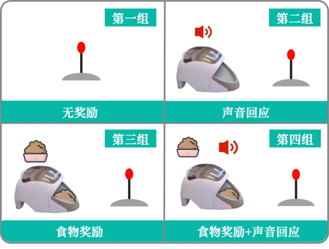 (分组详情) 图自:引文1/猫研所 训练每轮时长60秒,先将猫咪放在起点,让猫咪自由探索练习: ·如果猫咪有连续3次在5秒内鼻尖碰到红色区域的动作,这轮训练就提前结束; ·如果猫咪未碰到红色区域,则在60秒后训练自动结束。 每组猫咪都分别进行25轮这样的训练。 最终结果如何? ▌ 实验人员记录了猫咪试验成功的次数,结果发现: 2组(食物)和3组(食物+声音)的猫咪,都在2轮训练后就成功学会了动作 ; 但第1组(无反馈)和第4组(声音)的猫咪,在25轮训练后,依旧失败。
