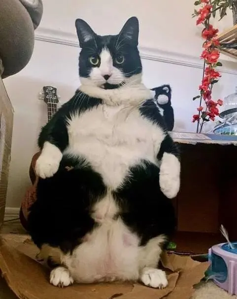 而奶牛猫身上的这个毛病会更加明显一些,日常跑酷就不用说了。 你能想象一只猫咪,它对着空气指手画脚吗? 得亏它是猫咪,否则早就被人给送到精神病院里去了吧? -5胖到离谱 都说橘猫养不得,橘猫一不小心就会养成“橘猪”。 而实际上呢,奶牛猫亦是如此。 很多网友都表示自己家的奶牛猫,体重已经突破15斤了。 15斤是什么概念呢?就是正常的猫咪体重都保持在8斤左右。 它顶人家两个的重量,你说离谱吗?