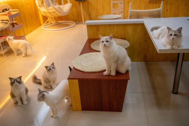 2021年9月,海南琼海一间猫咖的猫咪。(视觉中国/图) 成本、疏忽与“猫病” 对一间猫咖来说,几日无人的原因多种多样,结局却只有一种。 市场对猫充满热情,但死亡有时来得无声无息。王谦提起自己店里的猫,几天没有注意,当看到的时候,它已经趴在角落里奄奄一息。后来她察觉出原因,公猫用尿标记自己的地盘,店里的猫太多,它就会一直憋着以找到最合适的时机和地点。公猫的输尿管曲折,泌尿系统脆弱,憋尿引发感染,如果没有及时发现,就可能恶化成肾炎。 猫咖的动物太多了,就算“铲屎官”观察到粪便出了问题,也不知道生病的到底是哪一只,等发现时往往为时已晚。如果这是传染病,几天之内就会感染整个店里的小动物。 病猫让消费者望而却步,治病有时比买猫还贵,经营者不得不暂时提高对“猫病”的容忍度。猫的健康状况与猫咖经营的恶化互为因果,一天天拖下去,猫咖和猫一起变得虚弱。 不止生病会增加成本。习惯独居的动物用排泄物标记地盘,木地板看着漂亮,却留下刺鼻的气味,只能重新装修;小孩追猫、薅毛被抓伤,王谦既赔不是又赔钱。 市场的热情不足以支持密集的圈养。开业5年之后,猫吧结业,王谦发出领养的消息,几千上万元买来的猫,给个小红包就可以带走。她告知领养者猫的健康状况,并介绍自己熟悉的兽医。后来,这些分散在新家的动物们逐渐恢复健康。 即使猫咖经营良好,繁重的照料工作也令人疲倦。滕浩智提起一位朋友,对方的猫咖利润不错,但依然时不时地就想转行,“一年四季不能一天不喂,也不能一天不铲屎,整个人就被拴在那里”。 节假日、急事、疫情封控,对一间猫咖来说几日无人的原因多种多样,结局却只有一种。2021年8月,在成都的那间猫咖里,宇文化缘见到了猫咖的老板,他一脸茫然——自己因为家人身体不好,就把店铺交给兼职店员管理后返乡,却没想到半个月后情况恶化至此。后来,“和猫住”买下了店铺里的大多数猫,把它们送去治疗,但小猫的抵抗力差,送医之后有一半死去,其中一只因为眼球的感染太严重而做了眼球摘除。