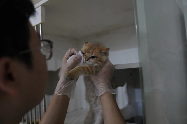 2021年9月,成都,“和猫住”工作人员为一只从猫咖救援出来的有眼疾的猫擦眼睛。(视觉中国/图) 更多的疾病来自疏忽,而不是恶意。当猫只不过是诸多装饰手段的一种,那么生病也就如同摆件落灰、钉子生锈一样常见。 2021年下半年,在广州的一条商业街上,几个年轻的上班族合伙开起一间猫咖,其中一个人还把自家的宠物猫放在店里“打工”。在猫咖附近工作的子涵说,猫咖老板到附近的商户里做宣传,拉邻居们进自家的客户群。正对街的玻璃窗里,木头展示柜分成三层,每一个格子几十公分长宽,摆着猫砂盆和碗,其中两个格子间里都挤着两只猫。 子涵爱猫,很快就看出格子间里猫的异样。三个标间的空间不够大,就算是独居的布偶猫也很难转身,它们每天缩在角落里只是睡觉,对来往的路人置之不理。 如果买奶茶,就可以把猫从柜子里抱出来放风。子涵偶尔光顾,每次都会把所有猫都放出来。短暂的自由从来不会让它们兴奋,几只猫都没什么反应,即便是放在腿上也只是乖乖地趴着。子涵以往参与过救助小动物,总是习惯性地观察猫的健康状况,而这几只确实不大好,摸起来骨节分明,长毛的下面藏着跳蚤。没过多久,它们的耳朵里长出红褐色的污渍,这是耳螨,常寄生在猫狗的耳道里,有时会诱发细菌感染。 这在流浪猫和饲养不当的猫身上太常见,子涵偶尔提醒店员,但并没有多言;直到几个月之后的2022年春节,几只猫在店里被饿得奄奄一息。 子涵的店铺在假日里一直营业,她每天经过这间猫咖馆去上班,连着4天没见过店员,眼见柜子里的猫砂几乎全部结块,粪便越积越多,猫粮稀稀拉拉;再过两天,有的格子里多了呕吐物,猫粮见了底。 她忍不住在猫咖的客户群里几次提醒老板喂猫,对方终于在大年初五那天打扫了猫笼,添了食水。但子涵的提醒被看作是多管闲事,她被要求退群。年后没过多久,展示柜一夜之间运走,店主搬离了这个街道。 即便没有子涵的抗议,这间猫咖或许也坚持不了太久——猫咪糟糕的健康状况和精神状况,无法让消费者停下脚步。滕浩智说,这样的故事太普遍了,有时候他接到咨询的信息,一眼看过去,瘦猫传递出再多宣传和运营都挽回不了的虚弱,就知道对方“没戏了”。 几个月以前,江西南昌一间猫咖倒闭。老板最初的规划很美好,店里有猫又有书,直到疫情,经营出现困难,猫开始接二连三地生病,她才决定把猫低价售出。 老板很后悔,说不负责的合伙人一走了之,店里才爆发了这么严重的问题——有一只母猫在没人照料的情况下生了小猫,等发现的时候,小猫已经全都死了。 当地小动物保护协会的一位志愿者买下了三只猫,在隔离、治疗之后把它们送养。她并没有谴责老板,老板并非存心虐待,甚至主动提出卖猫之后把笼子捐给小动物保护协会。