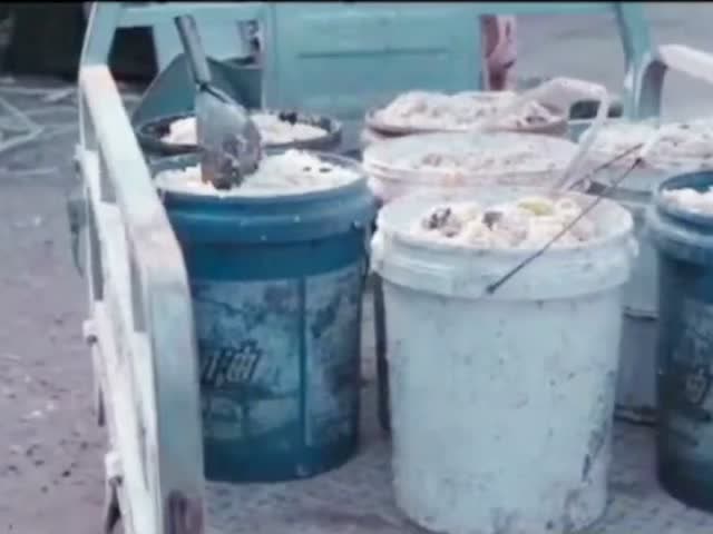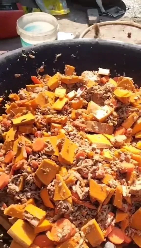 ▲刘姐吃力的翻炒大锅里的食物,那一天食物里掺了很多鸡皮鸡肉碎 每天为毛孩子的吃食操碎了心,两口子的饭菜却能凑活就凑合。