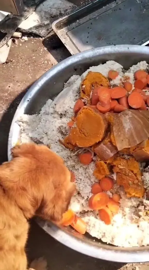 ▲毛孩子们吃的狼吞虎咽 迫于无奈,刘姐凌晨3点就要起床,去菜市场批发猪下货、鸡架子、南瓜和陈米。