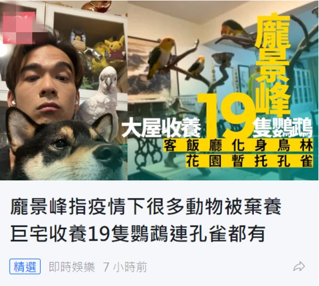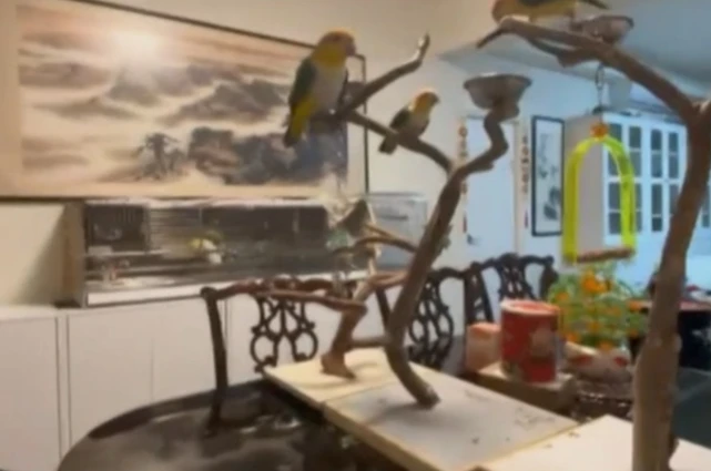 庞景峰自曝道,最近从社交网上得知很多动物被弃养,他跟妈妈便把这些动物接回来,家里目前收养了19只鹦鹉。他说话的时候,明显能听到很多鹦鹉的叫声。 之后,他拿着摄影头拍摄家里的各个角落,一张长桌上放了几根树枝,上面站着3只绿色的鹦鹉,毛色十分漂亮,一看就知道被照顾得很好。