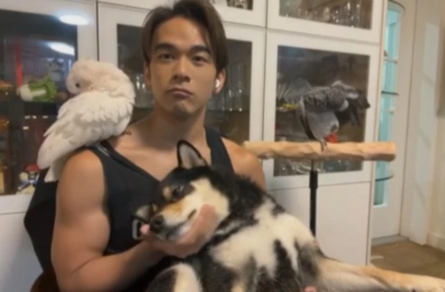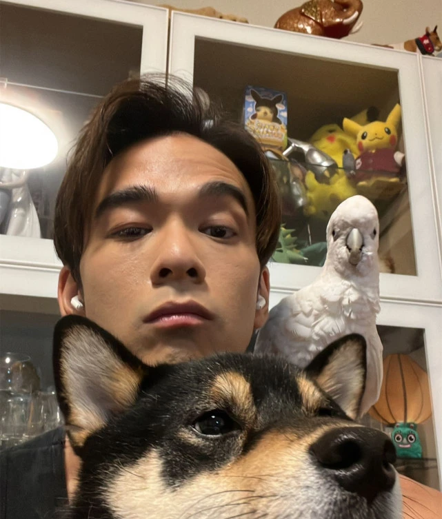 此次出镜,庞景峰怀里抱着一只狗狗,狗狗很是乖巧,任凭他抚摸。他的肩膀上站着一只白色的鹦鹉,旁边还有一只黑色的鹦鹉,画面相当有趣。