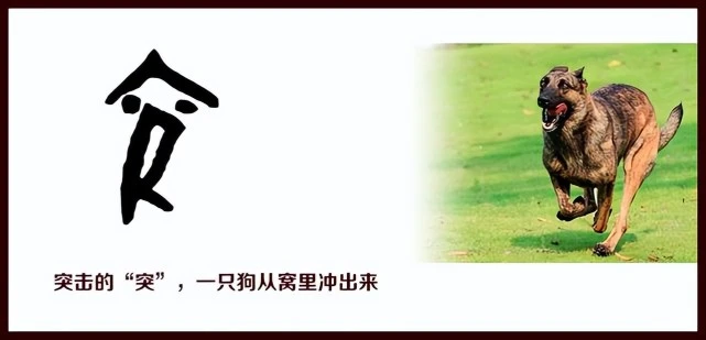 士兵突击的突 (如下图),上面是一个巢穴的穴 ,下面一个犬 ,表示狗突然从窝里面窜出来,令人猝不及防。所以狗给古人的印象是迅捷灵敏、气势上凶猛强悍的。