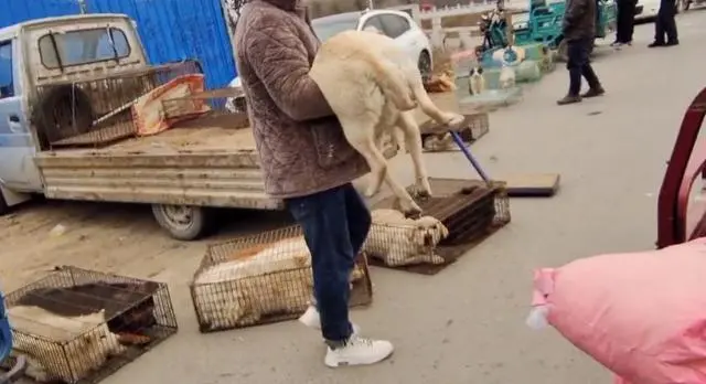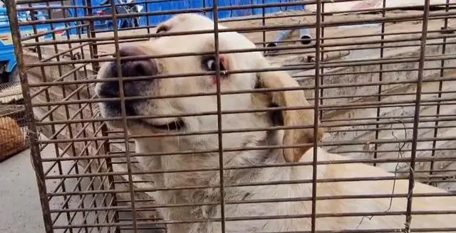 被摁进狗肉笼里的拉布拉多眼中充满了绝望 不过,狗贩子似乎觉得大叔这么做有点碍事,于是就直接来到那只拉布拉多的面前,然后就这么直接将狗狗脖子上的铁链解了下来,然后一把抱起那只拉布拉多,当着大叔的面直接就往一旁的狗肉车走,当狗贩子穿过地上装着各种宠物狗的狗肉笼,来到狗肉车上一个空着的狗肉笼旁时,大叔也立马跟了过去,而原本被狗贩子抓着的拉布拉多似乎也在此刻明白了自己的处境,开始变得不安分了起来……