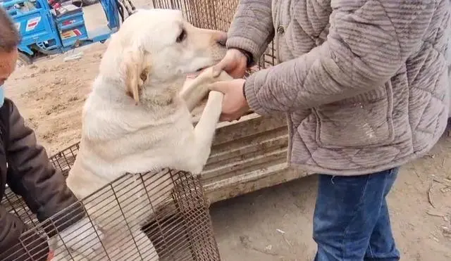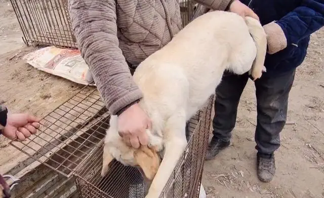 被大叔配合着送进狗肉笼的拉布拉多只能哀求地看着它面前的狗贩子 河南有位喜欢逛狗市的网友,也正因为这位网友经常会到当地的狗市,见到了太多类似的争议,也让这位网友明白双方的立场之余,也对市场中这样的现象而感到十分地无奈,毕竟,在狗市里,这样的情况实在太过于常见了,对于绝大部分被送到狗市里的成年犬,只要成交,就基本注定它们要被当成肉狗,送进狗肉馆,唯一的可能,就是狗狗的主人愿意改变主意,重新将它们带回去,可是,这样的概率实在太低了……
