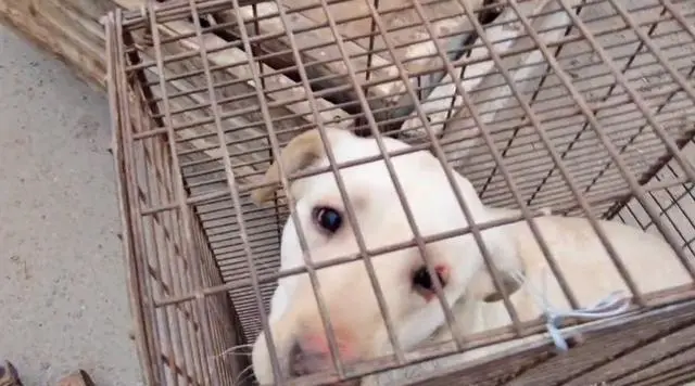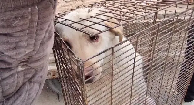 狗狗在狗肉笼里绝望地注视着围观的众人 看到狗贩子两次都失败,一旁围观的狗贩子们也纷纷调侃起来,就在狗贩子们互相调侃时,大叔也主动走了过来,并且来到狗狗的身边,然后等狗贩子准备好之后,就主动帮忙,将这只拉布拉多往狗肉笼里塞,眼看挣扎无望,这只拉布拉多在即将进笼子前还用前爪扒在狗贩子的身上,目露哀求地看着狗贩子,但最后,换来的却只是狗贩子和大叔两人不停地将它往笼子里塞的命运……