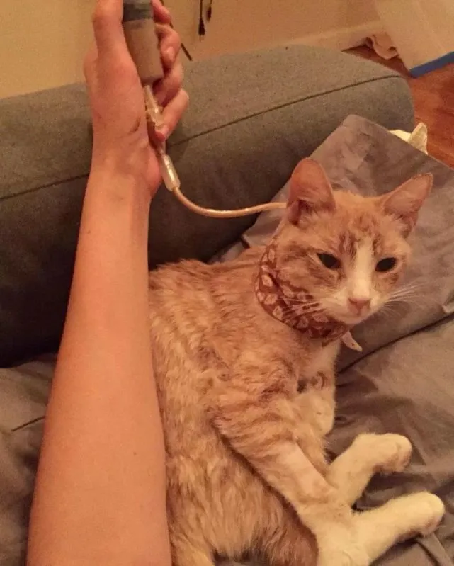 由于它口腔里的溃疡还很严重,再加上食道炎的影响,让吃饭成了它最大的挑战。无法进食,就无法给身体提供充足的营养,为了增强它的免疫力,促进它的上消化道愈合,不得不通过外科手术给它放置了一根喂食管。