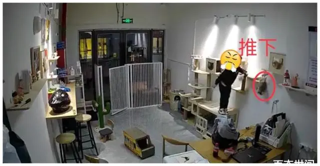 尔后,小男孩开始换起花样,在猫窝里抱出一只小猫后,使出吃奶的劲,把小猫推放到了较高处的猫架上,然后不顾安全,自己攀爬站到了猫窝上,一通乱拖拽推搡,将小猫推了下去。