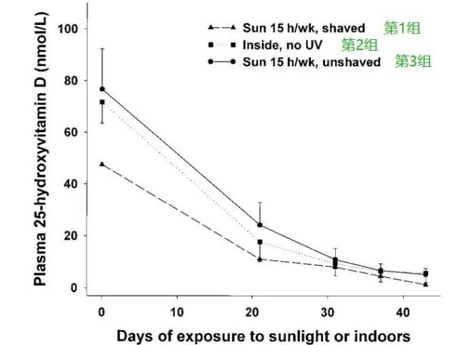 横轴实验天数,竖轴为25-OHD的浓度 25-OHD较7-脱氢胆固醇更稳定易测,其含量可表示血浆中VD的含量 图自:引文[5] 结果发现:三组猫咪体内25-OHD浓度的集体一路下降... James等人由此证明:晒太阳对猫咪来说,同样几乎没有促进VD生成的作用。 3 是因为毛发遮挡了皮肤吗? 事实上并不是。 在1987~2015年的多项实验中,剃掉背部毛发晒太阳的小猫咪(及小狗)都发生了VD缺乏... 由此说明毛发阻挡并不会干扰晒太阳的效果。