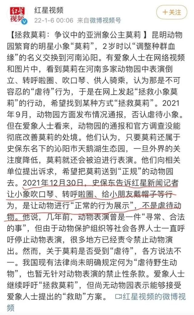 不少象粉纷纷发起拯救小象莫莉的行动,引起热议后相关单位也曾做出过回应。 2021年,记者联系到动物园主管部门,工作人员回应,得知相关情况后,已派出技术人员迅速调查,结果与网传情况不一致,不存在虐待小象情况。 今年年初,负责人接受媒体采访时也表示,园区内大象都由专业饲养员妥善照看,不存在虐待大象的情况,让大象站立,吹气球等动物演出是让动物进行“正常的行为展示”,不是虐待动物。