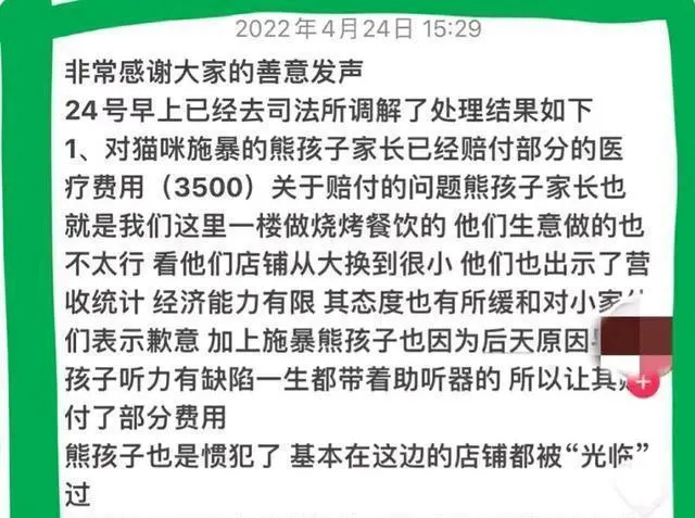 男孩家长是经营烧烤餐饮生意的,因为疫情生意不好、经济能力有限 ,其态度也有所缓和,加上该男孩也有其可怜的一面,因为后天原因存在听力缺陷,一生都需要带着助听器,因此胡先生只是让其赔付了部分费用。 而那四只在宠物医院治疗的小猫,24日晚上,几只伤情轻微已经接受完治疗的猫咪可以出院,最严重的一只还在医治,下周安排手术。 猫舍主人胡先生感觉是一个特别善良的人,当他进门说“小朋友,你在干嘛呢?”就能听出在那样紧急的情况下,他依然没有训斥孩子,吓唬孩子,而且事发后,他一再强调,不要网暴这个小男孩,而且也没有让男孩家长赔偿所有费用。 所以,小男孩这次真的是遇上了一个好人。 而反观小男孩及其家长,真是令人不敢恭维。 俗话说“三岁看大,七岁看老!”小男孩身体有残疾,本来很值得人同情,但这个孩子为什么就没有爱心呢?一点也不怜惜小动物,反而如此残暴残忍呢?在他幼小的心灵里,到底装的是什么?当他推开陌生的门,走进陌生的环境,为什么连一丝恐惧和胆怯都没有呢? 小男孩的家长刚开始也是很豪横,后来警方介入后态度才有所缓和,生意不好、经济能力有限,这些都不是耍赖的条件,关键的问题是,你孩子错了,你就得承担责任!而且,这小男孩如果不好好教育,未来真的堪忧!今天他摔的是猫,日后谁知道又会伤害什么呢?希望男孩的家长能够警醒,教育好自己的孩子。 免责声明:如果侵犯了您的权益,请联系站长,我们会及时删除侵权内容,谢谢合作! |
