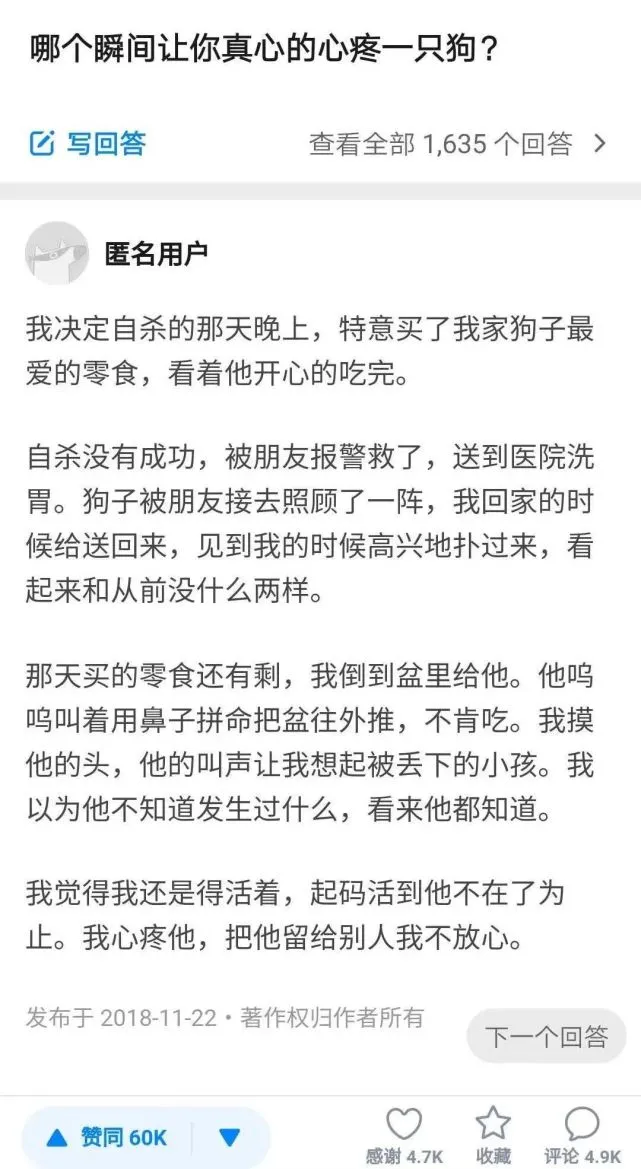 养狗的人总是格外惜命,因为他们担心的是: “如果我死了,我的狗要怎么办?” 一位住在辽宁大连的独居老人,无儿无女。 在她生命的最后10年里,一直是两只狗狗陪伴她。它们是母女,一只10岁一只4岁。 然而不幸的是,4月2日,老人因急性心肌梗塞去世了。 她留下的衣物和两只狗狗一起,被亲戚扔出了家门。 可是,它们并不愿意离开与老人生活的家。 或许,是无法接受老人去世的事实;又或许,是不知道发生了什么,只是在等主人接自己回家。 它们就这样一直在附近徘徊着,守了2天2夜都不肯吃东西,等一个再也回不来的人…… 累了,就趴在老人生前的衣服上休息,仿佛主人还在自己身边。 一位好心的邻居看不下去了,她联系了当地的动物保护组织。 负责人花花接到电话后立即赶了过去,当时狗狗正痴痴地站在门口不愿离开…… 花花耐着性子跟它们说: “跟我走吧,你家里没人了,他们不要你了...” 狗狗低声地呜咽着,它们不愿相信这个事实,像受伤的小兽一般紧紧盯着花花。 后来,在好心邻居的帮助下,花花成功带走了两只狗狗。 好心的邻居自己也养了4只狗和2只猫,所以非常理解它们: “你们已经陪伴主人10年了,你们有功啊!饥一顿饱一顿的你们也不嫌弃,还这么忠诚,他们会给你找一个新家和爱你们的新主人,不要在外面流浪,这车水马龙的多危险啊...” 她还把那件老人留下的衣服一起交给花花带走了。 幸运的是,检查后发现两只狗狗都很健康,花花也把它们的信息分享到了网上,希望尽快帮它们找到新的主人…… By-Wb@青流视频 Jindol是一只老年犬。 性格像个倔老头一样的它,经常偷偷溜出门,下雨天也不例外。 主人担心淋雨对它的身体不好,于是一次次把它抱回来,可一眨眼的功夫,它又不见了。 如果强行不让出去,它就会把家里的大门挠出一道道抓痕… 所以……Jindol为什么要出门呢? 原来它和主人的婆婆,也就是老奶奶的感情非常要好,不管奶奶去哪,Jindol都会跟着她。 可惜2年前,奶奶去世了。 Jindol不但偷偷跟去了医院,后来还出现在了葬礼上。 它独自躲在角落里,默默地看着这一切。 自从奶奶去世后,Jindol就经常在外面游荡。 主人曾经好奇跟在后面,才发现它去的都是曾经跟奶奶去过的地方。 每天,它都按照以前陪奶奶散步的路线走一遍,希望在某一个转角再次遇到那个心心念念的人…… 后来,Jindol的年纪越来越大。 步履蹒跚的它,却依然没有停下来过…… 看着它颤颤巍巍的样子,主人感动又揪心,她决定辞去工作,每天陪着Jindol走它独自走过的道路。 主人希望Jindol可以在自己的陪伴下可以变得快乐,不再孤单,不再沉浸在悲伤的回忆里…… 它的名字叫小黑妹,主人是一位老爷爷。 不久前爷爷独自在家中去世,直到几天后才被邻居发现... 子女闻讯赶来处理了后事,可他们却赶走了爷爷最爱的小黑妹。 然而很多天过去了,小黑妹还是趴在家门口不愿离开,它像以前一样跟路过的人打招呼,就仿佛只是在等爷爷回家一般。 附近的邻居也会送来食物和水,直到某天晚上…… 当地突然刮起了台风,一个小姐姐路过看到瑟瑟发抖的小黑妹,果断地把它带回了家。 可天气转晴之后,小黑妹又一声不吭地跑了回去。 目前,小姐姐也在积极地帮它寻找领养。 相信爷爷一定会保佑小黑妹遇到一个好主人。 下面这只狗狗,叫captain。 它是这个墓园最忠实的员工,因为它已经守护这里11年了,在它主人的墓碑前... 主人因病离世,当家里人处理完后事,发现captain不见了。 直到一年后,他们才在祭拜时在墓园找到了它。而这里,离家至少有15个街区那么远! 女主人想带它回去,可captain却不愿意离开。 后来墓园的工作人员说,captain第一次来到这里时,低头在墓碑前闻了几个小时,无论怎么驱赶都不愿意离开,工作人员颇受感动便收养了它。 11岁那年,captain被检查出肾脏衰竭了,但它依然固执地守护在墓碑前,直到15岁永远地睡在了墓碑上... 知乎上,有网友提问: “哪个瞬间让你真心的心疼一只狗?” 热评第一,戳动了我的心... “为什么我决定不再自杀?“ “因为我的狗需要我...“ 点个“在看”转发出去 免责声明:如果侵犯了您的权益,请联系站长,我们会及时删除侵权内容,谢谢合作! |